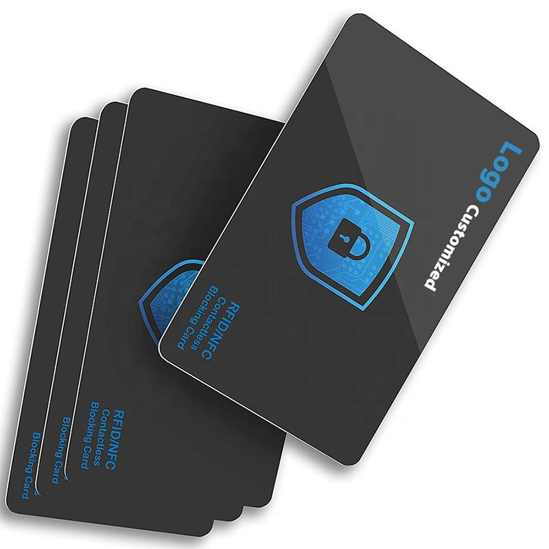 RFID Blocking Card/Shield Card ha le dimensioni di una carta di credito progettata per proteggere le informazioni personali archiviate su carte di credito, carte di debito, smart card, patenti di guida RFID e qualsiasi altra carta RFID dai ladri di borseggio elettronico che utilizzano RFID palmare scanner.
